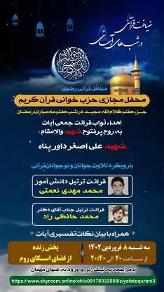 https://www.skyroom.online/ch/u09176033568/ziyafatequrani3 در فضای «اسکای روم» به این محفل بپیوندند؛ مراجعان باید زمان مراجعه روی لینک مهمان کلیک کرده سپس نام خود را وارد کنند تا وارد فضای محفل انس با قرآن کریم شوند.
