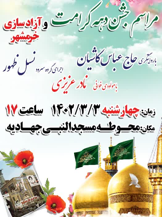 ادب از برگزاري جشن دهه کرامت و سالروز آزاد سازي خرمشهر در مسجد النبي(ص) جهاديه سمنان خبر داد.