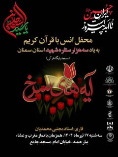 به گزارش روابط عمومی ستاد هماهنگی کانون های فرهنگی هنری مساجد استان سمنان، محمدامین حقیقت ؛ با اشاره به برگزاری محفل نورانی انس با قرآن کریم به یاد سه هزار ستاره شهید استان سمنان با عنوان «آیه های سرخ» در راستای مسجد پایگاه قرآن گفت: این برنامه با حضورمجتبی محمدیان قاری ممتاز کشوری و استانی برگزار می شود.