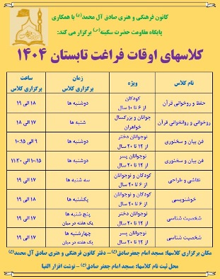 مدیر کانون فرهنگی هنری صادق آل محمد(ع) مسجد امام جعفر صادق (ع) مرودشت افزود: این کلاسها با همکاری پایگاه مقاومت حضرت سکینه (س) در رشتههای مختلف قرآنی از جمله: حفظ، روخوانی و روانخوانی برگزار میشود.