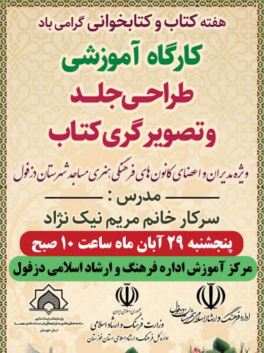 به مناسبت هفته کتاب و کتابخواني، کارگاه آموزشي طراحي جلد و تصويرگري کتاب ويژه مديران و اعضاي کانون هاي فرهنگي هنري مساجد شهرستان دزفول برگزار مي‌شود.